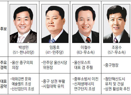울산 중구는 ‘울산 정치 1번지’로 불리는 곳. 보수층이 많아 역대 선거에서 신한국당과 한나라당 후보들이 불패(不敗)를 기록했다.