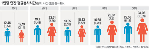 조선주 한국여성정책연구원 연구위원은 “여성의 자원봉사가 정부의 사회복지 서비스를 상당 부분 대체하고 있는 셈”이라며 “자원봉사도 기부금처럼 소득공제 대상으로 지정하는 방안을 도입해 더욱 활성화할 필요가 있다”고 말했다.