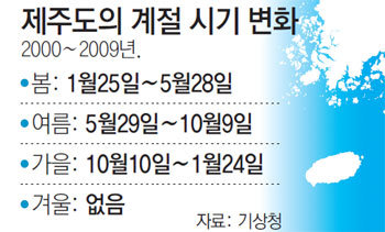 지구온난화 여파로 최근 10년간 제주도에서 겨울이 공식적으로 사라졌다. 기상청 국립기상연구소와 제주지방기상청이 24일 내놓은 책자 ‘기후변화 이해하기 Ⅵ 제주의 기후변화’에 따르면 제주에서 겨울 날씨를 보인 날은 1924∼1933년에는 평균 36일이었으나 2000∼2009년에는 평균 0일이 됐다.