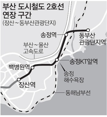 부산 도시철도 2호선 연장 추진에 동부산 지역이 들썩이고 있다. 부산시는 도시철도 2호선을 기장군 기장읍 일대에 건설 중인 동부산관광단지까지 연장하는 ‘도시철도 2호선 연장(장산∼동부산관광단지) 건설’에 대한 예비타당성 조사를 국토해양부에 요청했다고 16일 밝혔다. 4.1km에 이르는 연장구간에는 가칭 백병원역, 송정KT앞역, 송정역, 동부산관광단지역 등 모두 4개 역이 들어설 예정. 건설 사업비 2877억 원은 국비 1726억 원, 시비 1151억 원으로 충당한다는 방침.