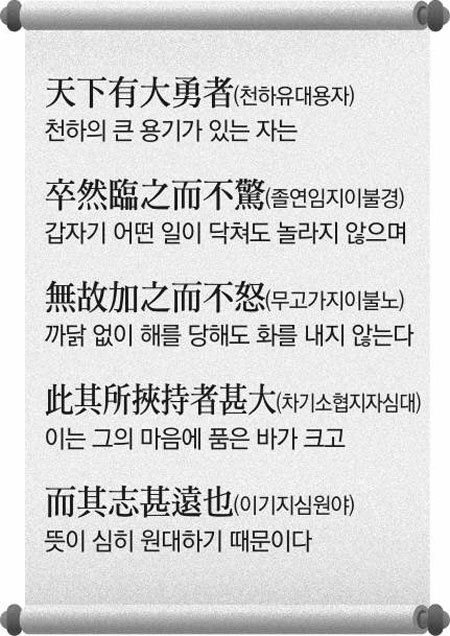 ‘天下有大勇者(천하유대용자·천하의 큰 용기가 있는 자는) 卒然臨之而不驚(졸연임지이불경·갑자기 어떤 일이 닥쳐도 놀라지 않으며) 無故加之而不怒(무고가지이불노·까닭 없이 해를 당해도 화를 내지 않는다) 此其所挾持者甚大(차기소협지자심대·이는 그의 마음에 품은 바가 크고) 而其志甚遠也(이기지심원야·뜻이 심히 원대하기 때문이다).’