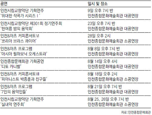 8월엔 정명훈 지휘자가 두 차례 무대에 선다. 그가 이끄는 아시아필아모닉오케스트라가 8월 8일 말러 교향곡과 브람스 교향곡을 연주하며, 8월 21일에는 정명훈, 김선욱, 양성원, 송영훈, 성민제, 이유라, 김수연 씨가 한자리에 모이는 ‘한국 최고 솔로이스트 앙상블-7인의 음악인들’ 공연이 열린다. 032-420-2736