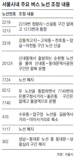 서울시가 승객이 적은 버스 노선을 폐지하고 승객 과밀 지역에 남는 버스를 추가로 투입하는 내용을 기본으로 한 시내버스 노선 조정안을 11일 발표했다. 조정된 버스 노선은 총 19개다. 주 내용은 크게 승객이 몰리는 노선 통합 및 변경(5건), 비효율 노선 조정(6건), 자치구나 시민들로부터 받은 불만 해소(8건) 등이다. 노선 통합 및 변경은 2219번(면목동∼신설동) 노선에서 청량리∼신설동 구간을 없애고, 1213번(국민대∼청량리)과 통합하는 것이 대표적인 사례다. 반대로 3318번(강동차고지∼마천동)은 강동구 암사동 주변에 아파트 단지들이 생겨나면서 버스 승객이 많아지자 중간 노선을 늘렸다. 강북구 수유동에서 강남구 압구정동까지 운행했던 410번은 그동안 배차 간격이 길다는 승객들의 항의가 이어졌다. 이에 따라 서울시는 길음역사거리∼미아사거리로 줄여 강북뉴타운 입주민들 전용 버스 노선으로 만들었다.