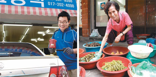 최근 미소금융재단으로부터 각각 창업임차자금과 무등록사업자지원자금 대출을 받은 광택업자 소균태 씨(왼쪽)와 야채노점상 장순임 씨가 20일 각자의 일터에서 환하게 웃고 있다. 사진 제공 SK미소금융재단