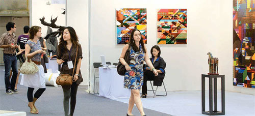 2010 광주비엔날레 개막을 하루 앞둔 1일 광주 상무지구 김대중컨벤션센터에서 현대미술의 다양성과 갤러리 대표 작가의 작품을 한눈에 볼 수 있는 광주아트페어가 열렸다. 독일 일본 중국과 국내 대형갤러리 소장 작품이 전시된 행사장을 큐레이터와 미술전문가가 살펴보고 있다. 박영철 기자 skyblue@donga.com