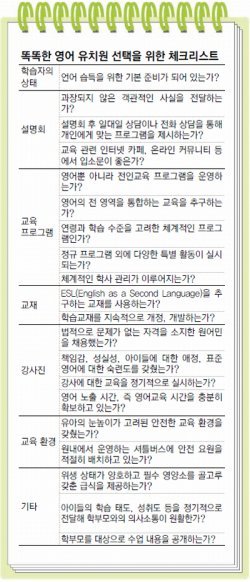 하지만 지나치게 내성적인 아이는 낯선 환경에 적응하지 못할 뿐 아니라 영어 자체에도 거부감을 느낄 수 있다. 아이의 성격, 기질이 어떤지 파악한 뒤 영어유치원을 선택하는 것이 좋다.