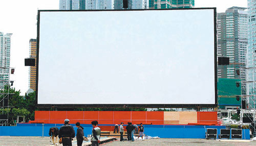 부산국제영화제 오늘 개막 제15회 부산국제영화제 개막을 하루 앞둔 6일 개막작으로 선정된 장이머우 감독의 '산사나무 아래'를 상영할 수영만요트경기장 야외극장이 웅장한 모습을 드러냈다. 초대형 스크린이 설치되고 초청 배우들과 유명인사들이 지나갈 레드카펫 공사가 진행되고 있다. 최재호 기자 choijh92@donga.com