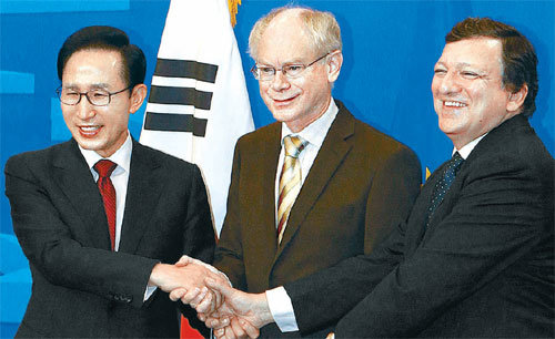 세계최대 16조달러 유럽시장 2011년 7월 열린다 6일 오전(현지 시간) 벨기에 브뤼셀 유럽연합(EU) 이사회 본부에서 열린 한국-EU 자유무역협정(FTA) 서명식에 참석한 이명박 대통령(왼쪽)과 헤르만 반롬푀이 EU이사회 상임의장(가운데), 조제 마누엘 두랑 바호주 EU 집행위원장이 손을 잡고 있다. FTA 협정문 서명은 김종훈 통상교섭본부장과 카럴 더휘흐트 EU 통상담당 집행위원이 했다. 브뤼셀=김동주 기자 zoo@donga.com