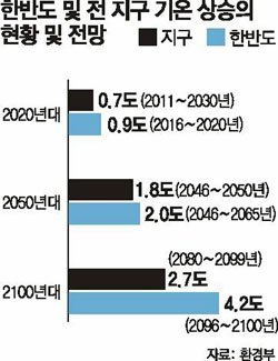이로 인해 한반도 기온이 높아져 아열대종이 증가하고 홍수와 가뭄 발생이 잦을 것으로 전망됐다. 한반도 기후변화는 농업 보건 등 일상적인 삶에도 큰 변화를 줄 것으로 보인다. 보고서는 2040년에는 감귤 재배면적이 북상해 한반도 내 재배 적합지 면적이 현재보다 36배 확대될 것이라고 예측했다. 또 폭염 피해가 늘어 2050년과 2080년의 식중독 발생률은 지금보다 각각 15.8%, 26.4% 증가할 것이라고 내다봤다. 이 보고서는 국내외 연구논문 1500여 편을 분석한 것으로 기후변화 감시와 예측, 영향과 적응 두 부문으로 구성됐다.