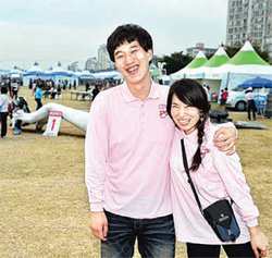 11일 오후 대구 동구 전국평생학습축제 행사장에서 자원봉사자 권재구 씨(왼쪽)와 류연희 씨가 마무리 작업을 앞두고 기념사진을 찍고 있다.장영훈 기자 jang@donga.com