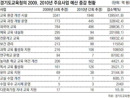 김 의원이 공개한 자료에 따르면 경기도교육청은 교육 환경 개선 시설비에서 가장 많은 1395억 원을 줄였다. 이 돈은 교내 노후 시설 개선에 쓰이는 돈이다. 그 밖에 교육 과정 개발 운영, 외국어 교육, 체육 교육 내실화 등에서 각각 200억 원을 넘게 줄였다. 도교육청이 주요 예산에서 줄인 사업비는 총 2831억 원이었다.