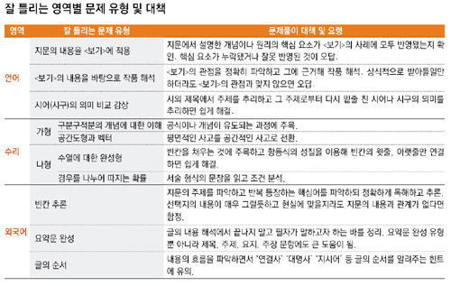 《대학수학능력시험이 열흘도 채 남지 않았다. 이제는 실제 시험에서 지나치게 긴장하거나 사소한 실수에 당황하지 않도록 평정심을 길러야 한다. 실전에서의 실수 하나는 지금까지의 노력을 수포로 만들 수도 있다. 따라서 영역별로 실수하기 쉬운 부분에 특히 유의하면서 갈무리해야 한다. 영역별로 실수를 줄이기 위해 주의해야 할 점은 무엇이고 어떤 문제를 특히 유의해야 하는지 알아보자.》 언어영역