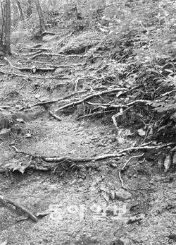 최근 북한산, 지리산 둘레길과 제주 올레길 등 이용객이 급증하면서 각종 쓰레기가 버려지고 흙길이 무너지는 등 환경훼손 문제가 발생하고 있다. 등산객이 몰리면서 속리산 버리미기재∼대야산 구간 탐방로 바닥의 나무뿌리가 드러나 있다. 동아일보 자료사진