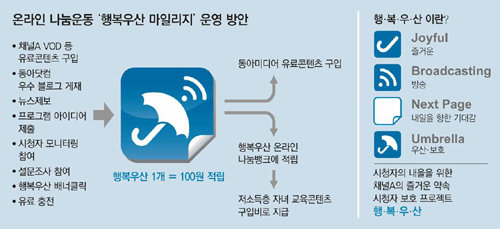 시청자가 직접 동참할 수 있는 채널A의 온라인 기부운동인 ‘행복우산 마일리지’도 새로운 미디어 공익활동의 모델로 개발했다. 시청자가 채널A의 유료 콘텐츠를 이용한 뒤 이용실적에 따라 적립한 마일리지를 저소득층 교육콘텐츠 구입비용으로 기부하는 온라인 나눔 캠페인이다. 시청자가 기부한 액수만큼의 마일리지를 채널A가 더 기부하는 방식으로 운영된다. 6개의 교육콘텐츠 기업이 뜻을 같이하기로 하고 채널A와 협력관계를 맺었다.