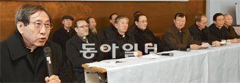 13일 오전 서울 중구 정동 프란치스코 회관에서 사제들이 정진석 추기경의 4대강 관련 발언에 대한 입장을 밝히고 있다. 함세웅 신부(왼쪽)와 문정현 신부 등 25명이 서명한 성명을 통해 추기경의 서울대교구장직 용퇴를 주장했다. 홍진환 기자 jean@donga.com 이에 앞서 허 신부는 이날 오전 8시경 한 라디오 방송에 출연해 최근 논란에 대한 정 추기경의 입장을 설명했다. 허 신부는 3월 주교단 성명에 대해 “추기경이 일부 성당에서 사제들이 4대강 반대가 주교단의 결정이라고 말해 신자들이 죄의식을 느끼는 경우도 많다는 보고를 받고 깊은 우려를 해 왔다. 그래서 주교단 결정은 우려이지 4대강 반대가 아니라는 것을 밝힌 것”이라며 “추기경은 4대강 찬반은 전문가들조차 판단하기 어려운 것으로 보고 있다. 추기경은 이 문제가 신앙의 문제가 아니기에 신자들의 양심에 평화를 줘야 한다는 사목적 의도로 발언했다”고 말했다. 이어 그는 “명동성당 개발은 20여 년 전 김수환 추기경 때부터 진행했다. 법의 절차를 지켜 준비했고 4대강 사업과 명동 개발을 연결하는 것 자체가 난센스”라고 말했다.