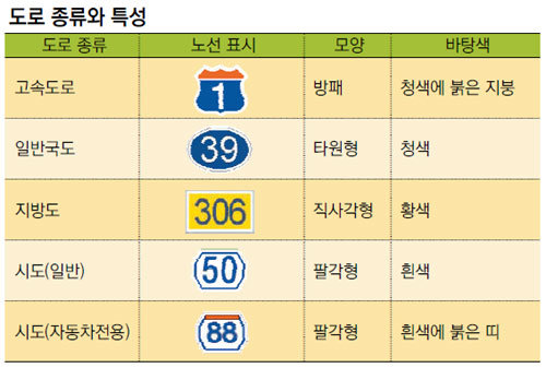 고속도로와 국도는 번호가 같아도 문제없다. 표지판에 표시되는 무늬가 다르기 때문이다. 고속도로는 방패 모양, 국도는 타원형 안에 번호를 쓴다. 지방도는 노란 직사각형, 도시 안의 도로는 흰색 팔각형 안에 번호를 쓴다. 특히 지방도는 첫 자리 번호를 보면 지역을 알 수 있다. 경기 3, 강원 4, 충북 5, 충남 6, 전북 7, 전남 8, 경북 9, 경남 10, 그리고 제주의 지방도는 번호가 11로 시작한다.