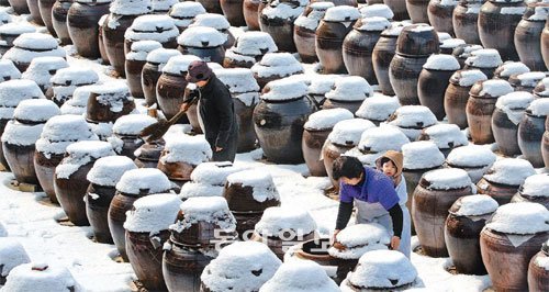 성탄절 연휴이자 올해 마지막 주말을 맞은 26일 전원생활의 안락함과 느긋함을 추구하는 ‘슬로 시티’의 한 곳인 전남 담양군 창평면 전통된장 제조 농가 장독대에도 흰눈이 수북하게 쌓여 눈을 쓸어내는 주민들의 손길이 분주하다. 전국 곳곳이 꽁꽁 얼어붙는 한파가 이어진 이날 서울의 아침 최저 기온이 영하 13도로 떨어졌다. 기상청은 “서해상에 눈구름이 발달하면서 영향을 받고 있다”며 “27일 낮부터 점차 날씨가 풀릴 것”이라고 내다봤다.