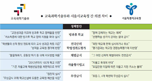 《“도대체 어느 장단에 맞춰 학교를 운영해야 할지 모르겠습니다. 장관은 학생들의 성적 향상에 따라 성과급을 주겠다고 하고, 교육감은 시험 자체를 치르지 말라고 하니….” 서울의 한 중학교 L 교장은 요즘 학교운영에 그 어느 때보다 애를 먹고 있다. 지난해 말엔 “참여도와 성적향상 정도를 지표로 학교 지원금과 교사 성과급에 차등을 두겠다”는 교육과학기술부 뜻에 따라 방과후 학교 운영계획을 짰건만, 얼마 지나지 않아 서울시교육청에서 “강제적인 참여는 물론이고 선행학습 성격의 수업도 금지한다”고 밝혀 운영계획을 급히 수정했다. 간접체벌 기준에 대한 교과부와 교육청의 입장 차이 때문에 아직 구체적인 학생지도 방안도 확정하지 못했다. L 교장은 “예년엔 전년도 11월이면 연간 학교운영계획안을 확정했지만 이번엔 이제야 초안 작성을 마쳤다”면서 “매일 학교운영계획 회의만 2∼3시간씩 진행하지만 교육정책에 대한 뚜렷한 기준이 없다 보니 그 무엇도 쉽게 확정할 수 없다”고 토로했다.》 특히 서울 경기지역의 교사와 학생, 학부모는 요즘 어느 때보다 어수선하다. 교과부와 시도교육청이 각종 교육정책을 두고 사사건건 팽팽한 줄다리기를 하고 있기 때문. 교과부가 “방과후 학교를 활성화하고 참여를 독려해야 한다”고 하자 이들 시도교육청은 “강제 참여는 안 된다”고 맞서고 있다. 교과부는 학생들의 성적을 끌어올려야 한다는 입장인 반면 이들 시도교육청은 아예 시험 자체를 없애려는 움직임을 보인다.