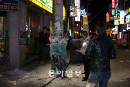 12일 오전 충북 청주시 흥덕구의 한 번화가에서 올해 대학에 입학하는 신입생 두 명이 밀가루 범벅이 된 채 전봇대에 묶여 있다. 경찰은 이날 갓 입학한 과 후배들을 묶고 밀가루를 뿌린 충북 모 대학 재학생 남모 씨(21)와 황모 씨(19)를 폭행 혐의로 불구속 입건했다.
