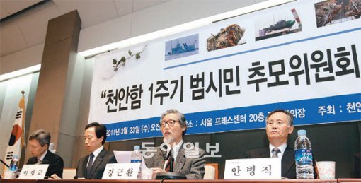 23일 서울 중구 한국프레스센터에서 열린 ‘천안함 1주기 범시민 추모위원회’ 발족 기자회견에서 강근환 공동위원장(전 서울신학대 총장·오른쪽에서 두 번째)이 발족 선언문을 읽고 있다. 추모위는 천안함 폭침 1년인 26일 서울광장에서 추모문화제를 개최할 계획이다. 오른쪽은 안병직 공동위원장(서울대 명예교수).