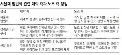대학노조와 공무원노조 소속 교직원, 총학생회 등은 꾸준히 서울대 법인화 법안에 반대해 왔다. 교직원들은 무엇보다도 공무원에서 법인 직원으로 신분이 바뀌는 데 대한 불안감이 크다. 정 위원장은 “대학이 비용을 줄이기 위해 직원에 대해 구조조정을 할 수도 있다. 또 성과에 따라 행정 및 재정 지원을 하겠다는데 직원들은 만성적인 고용불안과 성과를 위한 스트레스에 시달릴 수밖에 없다”고 주장했다. 이에 대해 서울대 남익현 기획처장은 “세계적 대학의 경쟁력을 갖추려면 법인화가 꼭 필요하다”면서 “법인 서울대의 발전을 위해서라도 구성원의 안정성이 중요한 만큼 구조조정 등은 고려하지 않고 있다”고 반박했다. 또 “직원들의 업무 역량 강화를 위해 SNU행정아카데미를 이미 출범시켰다”고 덧붙였다.
