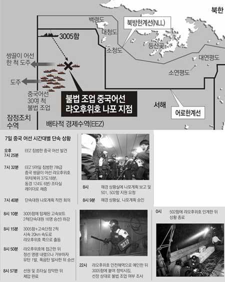 인천해경에 따르면 이날 서해5도 NLL과 EEZ 부근에는 중국어선 400여 척이 조업 중이었다. 이들은 한국 측 해역에서 불법어로를 하다 해경이 출동하면 재빨리 도망치는 수법을 쓴다. 특히 이들은 바다 밑바닥까지 훑어 어류를 닥치는 대로 잡는 쌍끌이 조업을 일삼기 때문에 중국어선이 한 번 다녀간 바다는 거의 고기 씨가 마를 지경. 연평도 어민 최율 씨(54)는 “중국어선이 다녀간 바다에서는 상당 기간 아예 고기가 잡히지 않는다”고 말했다.