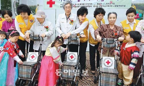서울적십자사는 20일 서울 동대문구 청량리동 세종대왕기념관에서 저소득층 노인 80여 명에게 ‘실버카’를 전달했다. 노인들은 바퀴가 달린 실버카에 간단한 짐을 넣고 편히 이동할 수 있다.