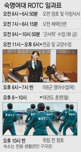 《 지난해 말 선발된 제1기 여성 학군단(ROTC) 후보생 29명이 기초군사훈련을 마치고 3월 대학 캠퍼스로 돌아왔다. 파란 단복을 입은 여학생들이 캠퍼스를 활보하는 모습은 대학가의 새로운 모습으로 자리 잡고 있다. 특히 여자대학으로서는 유일하게 ROTC를 선발하는 숙명여대에서는 개교 100년 이래 처음으로 ROTC가 학교에 모습을 드러내 많은 화제를 모았다. 두 달 반이 돼 가는 이들의 캠퍼스 생활은 어떤지 찾아가 봤다. 》