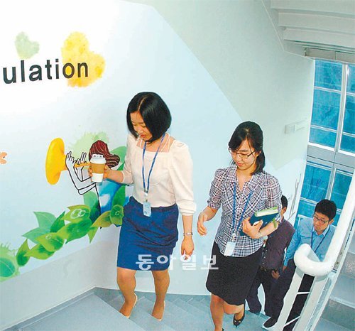 포스코건설 송도국제도시 사옥에 근무하는 직원들이 점심시간을 이용해 지상 1∼36층 사옥의 계단을 오르는 운동을 하고 있다. 계단 오르기는 평지 보행에 비해 칼로리가 두 배 이상 소모돼 직장인들에게 적합한 운동으로 인기를 끌고 있다.