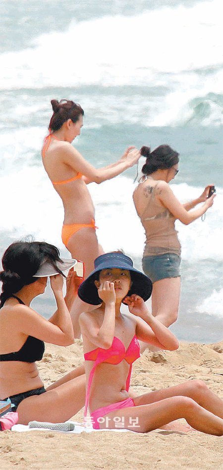 13일 부산 해운대해수욕장을 찾은 비키니 아가씨들이 일광욕을 즐기며 여름을 만끽하고 있다.