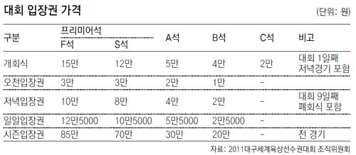 2011 대구세계육상선수권대회 입장권 판매는 순조롭다. 대회 조직위원회에 따르면 12일 현재 대회 입장권은 총 45만3962석 중 27만8085석(61.3%)이 판매됐다. 대회 기간 모든 경기를 볼 수 있는 시즌권은 매진된 상태. 가격이 1만∼5만 원으로 비교적 저렴한 A, B석도 거의 팔렸다. 지난해 8월 대회 개최 1년 전 D-365일에 맞춰 입장권 판매를 시작하면서 월평균 2만7000여 석이 예매되고 있다.