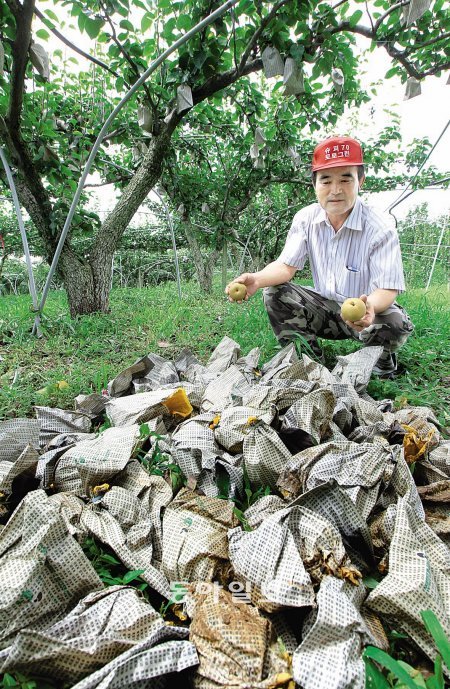 태풍 ‘무이파’가 지나가면서 추석 출하를 앞두고 있는 나주배 과수원에서 큰 낙과 피해가 발생했다. 11일 많은 피해를 본 전남 나주시 왕곡면 덕산리 한 과수원에서 농민 최의문 씨가 농작물재해 보험조사를 위해 침울한 표정으로 떨어진 배를 한군데로 모으고 있다.