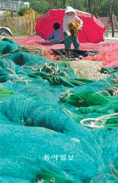 꽃게 출어기를 앞둔 어민들은 쉴 틈이 없다. 9월 1일부터 출어하는 꽃게잡이 어민들이 인천 남동구 논현동 소래포구 인근 공터에서 만선을 기원하며 분주하게 어망을 손질하고 있다.