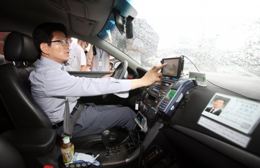 초보 택시운전사 김문수 지사에게 가장 힘든 것은 길 찾기. 김 지사는 네비게이션이 정말 고맙다고 얘기한다. 사진은 출발 전 네비게이션을 점검하는 김 지사.