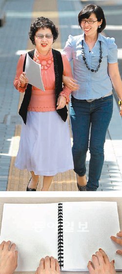 앞은 잘 보이지 않아도 세상을 사랑하는 마음을 담아 시를 써내려 가는 김혜란(위 사진 왼쪽), 김선미씨가 문예창작 프로그램 ‘마음에 문(文)을 열다’ 수업을 듣기 위해 점자 보도블록을 따라 발걸음을 내딛고 있다. 두 사람이 나란히 앉아 각자 쓴 시가 적힌 점자책을 손으로 읽고 있다(아래 사진). 이종승 기자 urisesang@donga.com