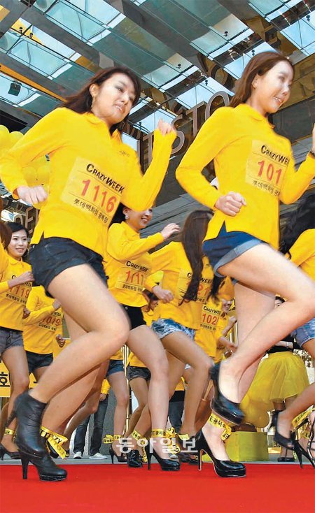 17일 오전 부산 롯데백화점 광복점 정문 앞에서 열린 크레이지 위크(Crazy Week) 행사에 참가한 여성들이 하이힐 신고 달리기 경기를 펼치고 있다. 광복점은 이날부터 7일간 단 하루 사은선물, 100% 당첨 경품 대축제, 이벤트 등 다양한 행사로 구성된 ‘크레이지 위크’를 진행한다.