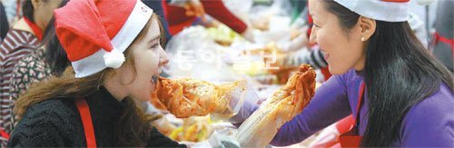 2일 서울 종로구청에서 열린 제4회 종가집 김장 나눔 마당에서 산타 모자를 쓴 자원봉사자들이 김장을 담그고 있다. 이날 행사에는 동국대로 유학 온 학생 등 외국인들도 참여했다. 이날 만들어진 김치 2.5t은 종로구 관내 소외계층에 전달될 예정이다.