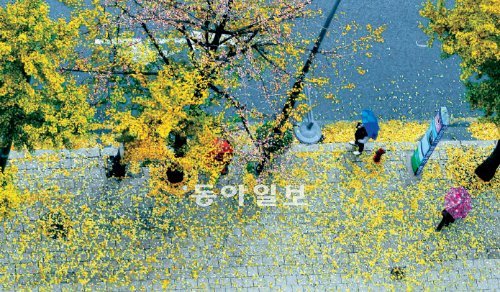 은행잎으로 거리에 점묘화를 그리고 싶었을까. 아니면 유난히 따뜻했던 계절을 시샘한 것일까. 가물었던 거리에 오랜만에 촉촉한 가을비가 내렸다. 6일 오전 서울 중구 태평로 한국프레스센터 앞에서 우산을 든 시민이 겨울을 기다리고 있다.
