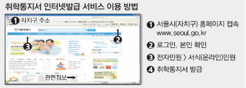 시는 각 자치구에서 내년에 초등학교에 입학할 어린이들의 취학 통지 자료를 받아 취합한 뒤 다음 달 2일부터 13일까지 인터넷 발급 서비스를 할 계획이다. 취학 대상 어린이의 보호자는 서울시 홈페이지(www.seoul.go.kr)에 접속한 다음 공인인증서로 본인 확인 절차를 거친 뒤 취학통지서를 발급받을 수 있다.