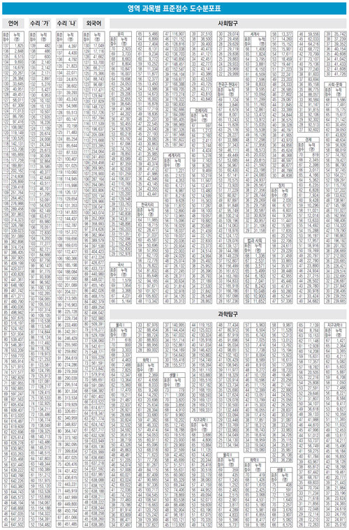 수능이 쉽게 출제되면서 표준점수가 크게 하락했다. 29일 입시기관들은 올해 수능의 최상위권 총점을 지난해보다 10점가량 낮은 540점 초반에서 550점 초반으로 봤다. 서울대 고려대 연세대의 인기 학과에 지원하려면 4개 영역 표준점수 합이 최소 530점 이상은 돼야 할 것으로 보인다.
