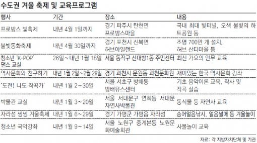 파주시 탄현면 프로방스마을에서는 ‘2011 프로방스 빛축제’가 한창이다. 발광다이오드(LED) 조명 400만 개를 이용해 만든 길이 180m의 빛터널, 사계절을 빛으로 표현한 하트공원 등이 인기다. 내년 4월 1일까지 계속된다. 포천시 신북면 허브아일랜드에서는 지난달부터 ‘2011 불빛동화축제’가 열리고 있다. 내년 4월 말까지 열리는 이번 축제에서는 700만 개에 이르는 오색 조명 등으로 단장한 동화 속 정원을 감상할 수 있다. 새로 조성된 허브산타마을에서는 루돌프 사슴 썰매와 스키 타는 산타를 만날 수 있다. ○ 역사부터 댄스까지 배워요