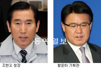 16일 서울 서대문구 미근동 경찰청사에서 열린 기자간담회에서 경찰 수장과 수사 실무책임자가 설전을 벌이는 이례적인 광경이 연출됐다. 경찰이 중앙선거관리위원회 홈페이지에 대한 디도스 공격을 국회의원 수행비서의 단독 범행으로 결론지은 것에 대해 두 사람의 견해가 충돌한 것이다. 이 자리에서 조 청장은 “공 씨의 단독 범행으로 볼 근거가 부족하다”는 시각을 보였지만 황 기획관은 “배후가 있다는 단서는 없었다”고 맞섰다.