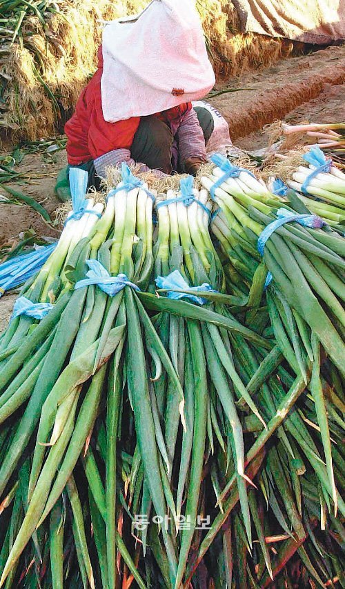 기온이 많이 올라간 27일 부산 강서구 명지동 밭에서 한 농민이 대파를 수확하고 있다.