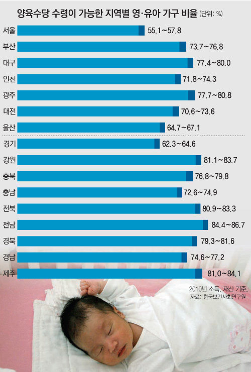 양육수당을 받을 수 있는 가구 비율이 지역별로 차이를 보이는 것은 양육수당 지급 기준이 전세금이나 집값이 높은 지역에 불리하게 돼 있기 때문이다. 내년부터 소득 하위 70%로 확대되는 양육수당의 지급 기준은 4인 가족일 때 월 ‘소득 인정액’ 480만 원 미만이다.