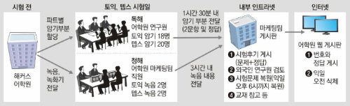 검찰에 따르면 조 씨 등은 2007년 10월부터 올해 초까지 토익 49차례, 텝스 57차례 등 모두 106차례에 걸쳐 회사 직원과 연구원 50여 명을 통해 시험문제를 빼낸 혐의를 받고 있다. 이들은 매년 초 응시 계획표를 만들어 독해나 듣기 등 파트별로 직원들이 맡을 부분을 할당했다. 또 시험을 보는 직원의 응시료를 어학원에서 내고 이들에게 특근 수당과 교통비까지 지급하기도 했다.