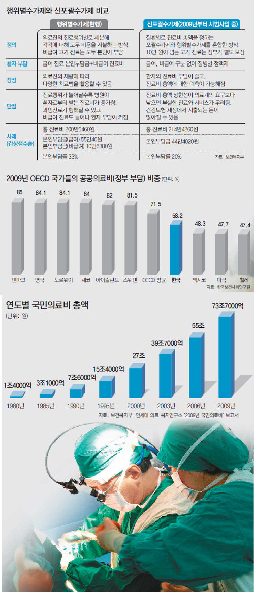 다만 암과 같은 복잡한 질환에 이 제도를 그대로 적용하기는 쉽지 않다. 이 때문에 복지부는 행위별수가제와 포괄수가제를 혼합한 ‘신(新)포괄수가제’를 만들어 놓고 2009년부터 다시 시범사업을 벌이고 있다. 지난해 7월 기준으로 항암치료, 뇌종양을 포함해 553개 질병이 대상이다.