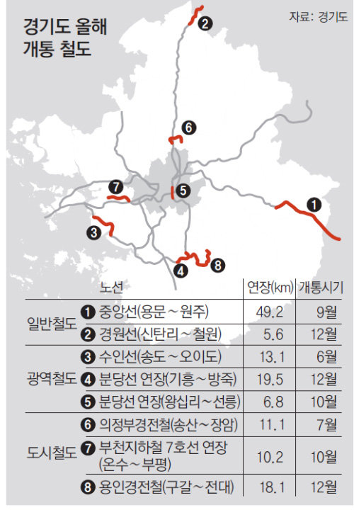 전액 국비가 투입돼 지역과 지역을 연결하는 일반철도는 중앙선 양평 용문∼강원 원주 49.2km 구간이 9월 개통한다. 도내 구간에는 지평 석불 구둔 매곡 양동 판대 등 6개 역이 신설된다. 용문∼원주 구간이 개통되면 중앙선 덕소∼원주 구간은 현재 1시간 20분에서 1시간으로 20분 단축된다. 경원선 연천 신탄리∼강원 철원 5.6km 구간도 12월 개통한다. 국비 75%를 투입해 지자체를 연결하는 광역철도는 수인선 송도∼오이도 13.1km 구간이 6월 개통한다. 경기지역인 시흥시에는 월곶역이 개통돼 월곶에서 오이도를 거쳐 안산과천선을 이용할 경우 사당까지 65분 걸린다.