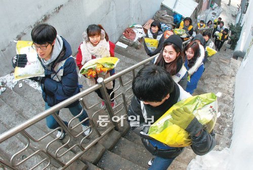 대한적십자사 서울지사 자원봉사자들이 8일 오전 서울 용산구 동자동 쪽방촌에서 연이은 한파에 힘겨워하는 저소득층 주민들을 위해 긴급 구호 활동을 하고 있다. 이들은 쪽방촌 850가구를 포함한 저소득층 1500가구에 쌀과 부식 등 구호 물품을 전달했다.