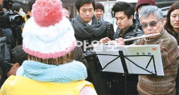 13일 오전 10시 35분 서울 종로구 중학동 주한 일본대사관 앞에 백발이 성성한 노인이 섰다. 한 손에 장미 한 송이를, 다른 손에는 플루트를 들고 있었다.