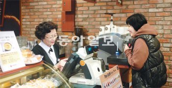 하얀색 블라우스에 남색 카디건 차림의 종업원은 이 가게의 바리스타 윤귀숙 씨(67·여)다. 윤 씨는 2009년부터 이곳에서 일하고 있는 베테랑이다. 하루 9시간 주 5일 근무에 월 100만 원을 받는다. 남편과 아이들 뒷바라지하며 주부로만 40년을 살다 친구의 추천으로 바리스타 교육을 받고 일을 시작했다. 처음에는 ‘캐러멜 마키아토’ ‘캐러멜 모카’ ‘카페라테’ ‘에스프레소’처럼 낯선 이름 때문에 실수도 많았다. 하지만 지금은 커피를 뽑는 윤 씨의 얼굴에는 여유가 가득했다.